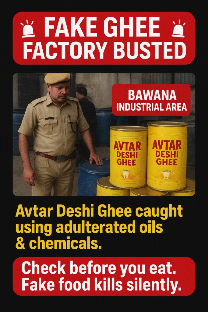 In a major action against food adulteration in Delhi, the Delhi Police and the Food Safety Department unearthed a large-scale operation producing fake “Avtar Desi Ghee” in the Bawana Industrial Area. During the raid, officials seized 7,600 litres of adulterated ghee and 900 litres of vanaspati and groundnut oil used to manufacture the spurious product.
